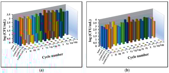 The composites were placed into suspensions of bacterial cells at known concentrations and incubated for half an hour, after which the bacterial concentration was measured. For testing re-usability, the composites were transferred into fresh suspensions of bacterial cells. It can be seen that immobilized CuONPs caused a decrease of approximately 2 log10 in the concentration of S. aureus cells during 9 cycles, and 1 log10 in cycles 10–11 of re-using the sample (Figure 6a), whereas it was inactive against E. coli (Figure 7b). The samples of immobilized CuNPs and Cu2ONPs were active against both bacteria and totally eradicated the S. aureus (Figure 7a) and E. coli (Figure 7b) cells for at least 13 cycles of re-use.