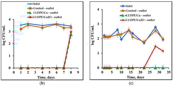 Antibacterial effect of CuNPs and Cu2ONPs immobilized onto LLDPE rolled into a column (a) against S. aureus (b) and E. coli (c) cells in a continuous regime. Cell concentration was measured at the inlet to the system and at the outlets of the columns with LLDPE/CuNPs and LLDPE/Cu2ONPs composites, and from a control column.