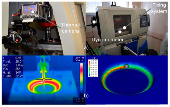 All experimental tests were conducted without lubricant fluid, and therefore, a high-temperature gradient is localized in the punch-sheet contact. The gradient of temperature localized in the plastic sheet along the wake generated by the steel tip is due to the frictional sliding and the plastic deformation. The temperature increment in the thermoplastic sheet requires a temperature-dependent material model to simulate the softening behavior during forming. Throughout the experimental tests, forces and temperature were measured by a 9257BA Kistler dynamometer table (Kistler Instrumente AG., Winterthur, Swizerland), and a 320 × 240 pixel resolution Flir T335 thermal imaging camera (FLIR® Systems Inc., Wilsonville, OR, USA), respectively (Figure 3).