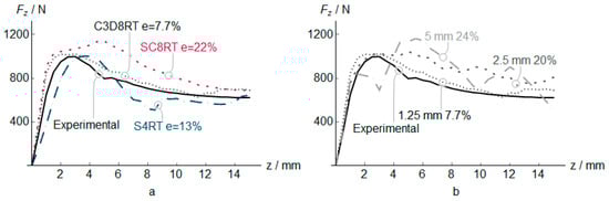 Vertical force Fz in PVC incremental forming. Experimental vs. predicted mean values at z positions, and estimation error e for different elements (a), and different C3D8RT sizes (b).