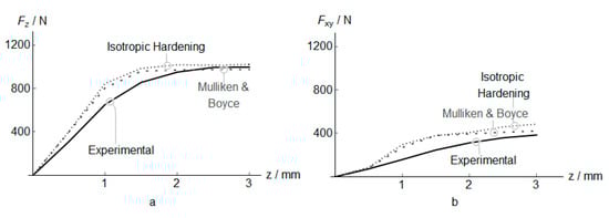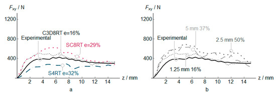 The in-plane force Fxy is presented in Figure 5. As in the case of vertical forces, the C3D8RT obtains the best correlation with experimental results. The 1.25 mm elements provide the best estimations as in the Fz results. Besides, the error is higher than for the Fz predictions. Please note that we do not evaluate the effects of temperature, pressure, and sliding in the friction coefficient as use a simple Coulomb frictional model, but the introduction of a more advanced friction coefficient could reduce the error in the numerical results [29].