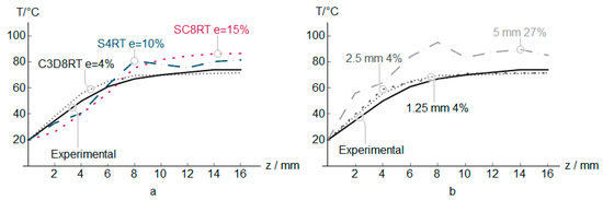 Temperature in PVC incremental forming. Experimental vs. predicted values at z positions, and error e for different elements (a), and different C3D8RT sizes (b).