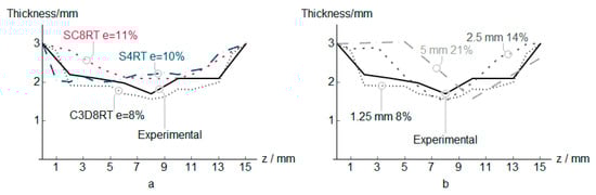 PVC sheet thickness estimation for different element types (a) and C3D8RT sizes (b).