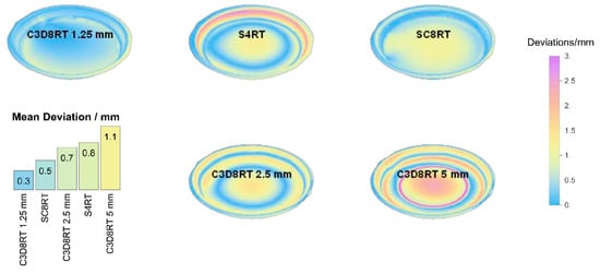 The color plot in Figure 8 portrays the geometrical deviation between the predicted and the real final shape. The smallest error was obtained by C3D8RT elements with a mean deviation of 0.3 mm. The shell elements and the C3D8RT with an element length of 5 mm show the highest deviation. The increment of the element size produces instabilities during the analysis and leads to a weak correlation between the numerical and the real part.