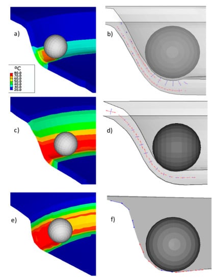 Regarding the temperature distribution through the sheet thickness (Figure 9, left), the element C3D8RT displays the maximum temperature on the contact side that undergoes compressive stress due to the friction force. It is similar to the experimental results obtained with the thermal camera (Figure 3b). In the case of SC8RT and S4RT, the temperature distribution is not well defined, showing similar temperatures in the external and internal sides.