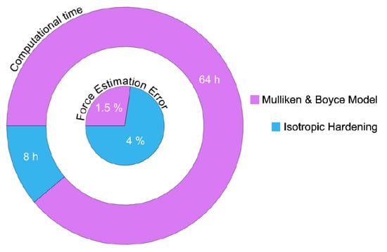 Table 3 shows the numerical factors tested. The element type tested were three-dimensional 8-nodes linear element (C3D8RT), two-dimensional 4-nodes bilinear element (S4RT), and a three-dimensional 8-nodes linear element, finite membrane strain (SC8RT). All are first-order elements (to reduce the processing time) and have a coupled displacement-temperature formulation with selective reduced integration scheme avoiding the hourglassing. On the other hand, three element’s sizes were tested, the minimum element length of 1.25 mm (small enough to obtain good results, avoiding small step time), 2.5 mm and 5.0 mm. Finally, the proposed model was compared to a complex rheology material for testing the differences in accuracy and computational time.