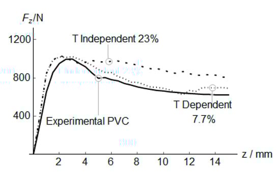 The temperature generated by the friction and inelastic deformation is the primary mechanism involved in the reduction of the mean vertical force. Mulliken et al. [28] through a Dynamic Mechanical Analysis (DMA) thermogram of PVC, showed that the ratio between loss and storage modulus (tan δ) increases from 0.015 at room temperatures up to 0.075 at 74 °C that is the maximum temperature registered during the forming process. This increment of temperature is not homogeneous in the whole section (Figure 9), but in the elements in contact with the punch, subjected to compression stress states, exhibits the higher temperature while the elements in the external surface subjected to traction, the increase of temperature is reduced. For this reason, in the range of temperatures studied, the viscoelastic nonlinearities do not have a significant influence on the forming process of PVC.