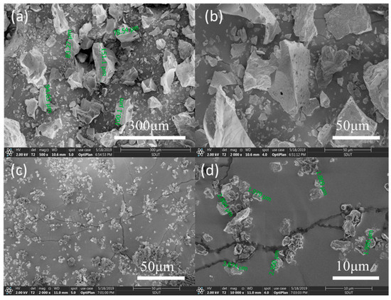 SEM micrographs of the lunar regolith simulants powder. (a,b) before the ball mill. (c,d) after the ball mill.