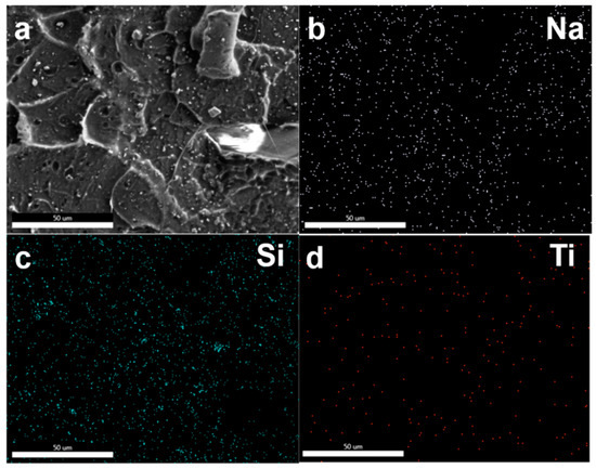 It is well known that lunar regolith consists of several kinds of oxides, such as silicates, metal oxides, and so on. To further demonstrate the dispersity of the multi-oxides in the polymer matrix, the lunar regolith present in the PLA matrix was analyzed by energy dispersive X-ray spectroscopy (EDS). As seen in the EDS mapping images (Figure 5), typical Na, Si and Ti elements were uniformly dispersed on the fractured surface of the PLA matrix.