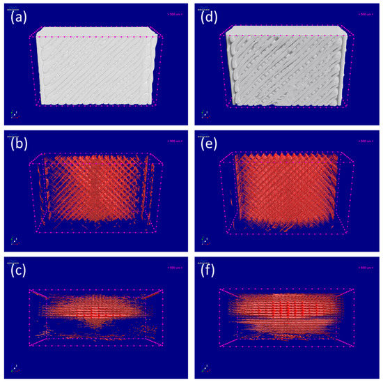 X-ray computed tomography (XCT) scanning of 3D printed PLA and PLA/CLRS-1 composites. Left (a–c): PLA; Right (d–f): PLA/10% CLRS-1. (a,d) present the schematic diagram of XCT scanning sample. (b,c,e,f) illustrate the 3D image from different angles. The Z-axis is the printing orientation, Y-axis is building orientation, and the deep orange parts are pores.
