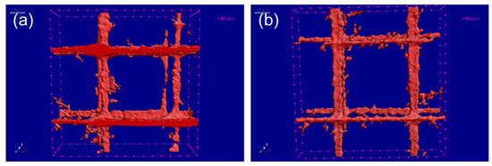 To further study the microstructures of the printed PLA/CLRS-1 samples, an XCT analysis was used to determine their porosities, pore distributions and pore sizes. In recent years, XCT has played an increasingly important role in the nondestructive testing of 3D printed parts. Figure 6 and Figure 7, respectively, display the 3D reconstructed pore distributions of the PLA and PLA/CLRS-1 samples. On the outside surfaces of the printed specimens (Figure 6a,b), it can be seen that with the addition of lunar regolith, the gaps between adjacent extruded filaments have been enlarged. In terms of the 3D reconstructed pore distributions of the printed specimens, a regular crossed inter-connective porous structure was formed in all the printed specimens, which revealed the 3D printing path. Moreover, it can be concluded that the pore distribution of both printed specimens was inhomogeneous, on account of the temperature gradient of the build chamber. This is because the initial printed layer, which was closer to the print bed, experienced higher temperatures, which increased the flow of the extruded melt and reduced the gaps between adjacent filaments and layers. The crossed inter-connective porous structure and inhomogeneous pore distribution was also consistent with our previous work on 3D printed PEEK and CF/PEEK parts [9].