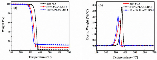 The thermogravimetric curves (a) and differential thermogravimetric curves (b) of 3D printed neat PLA and PLA/CLRS-1 composite specimens.