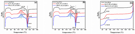 Differential scanning calorimetry thermogram of (a) the first heating, (b) the second heating, (c) the first cooling of 3D printed neat PLA and PLA/CLRS-1 composite specimens.