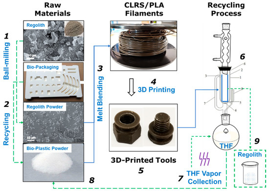 Schematic diagram of the fabrication and recycling of the component, lunar regolith ball milling (1), PLA recycling (2), raw material regolith and PLA melt blending, extrusion (3), 3D printing (4), final 3D printed tools (5), recycling process (6), tetrahydrofuran (THF) vapor collection (7), recycled PLA (8), recycled regolith (9).