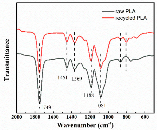 Next, we analyzed the feasibility of the PLA powder obtained after the recycling process. For this purpose, the chemical structure and molecular weight were analyzed by FTIR-ATR and GPC. Figure 11 presents the FTIR spectra of the raw and recycled PLA samples, which showed the characteristic peak of the C=O group (1749 cm−1), methyl group bonds (1451 and 1369 cm−1), C–O (1188 cm−1), and C–O–C structures (1081 cm−1) [41,42]. Therefore, the FTIR spectra preliminary illustrated that no obviously degraded byproducts were found in the recycled PLA, and the recycled PLA could be reused in future applications.