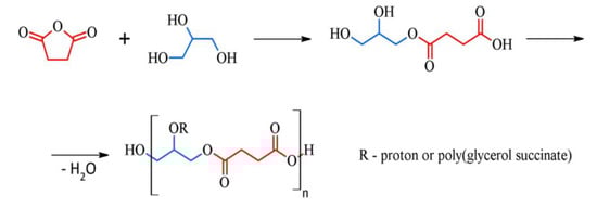 Poly(glycerol succinate) (PGSu) is one of the examples of polyesters obtained from glycerol and dicarboxylic acids such as adipic, sebacic, or succinic acid []. PGSu is synthesised from two bio-based monomers—glycerol and succinic acid (Figure 1). Glycerol is a major by-product of the biodiesel industry. In 2012, the production of bioglycerol reached over 2 million tonnes []. Succinic acid is a product derived from the fermentation process of biomass resources, and its production has also been developed on an industrial scale []. To synthesise biodegradable polyesters from glycerol and succinic acid, bulk polycondensation in the absence of a solvent and a catalyst is used. Moreover, no toxic waste materials are produced during the reaction. PGSu macromolecules can form dendrimers, branched, highly branched, and hyperbranched polymers []. Synthesis conditions have a significant impact on the physical and mechanical properties of HBPEs due to differences in molecular weight, cross-linking density, and degree of branching. The obtaining of liquid or gelated form depends on the molar ratio of reactants determining the ratio of hydroxyl to carboxylic groups [].