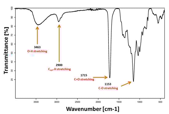 The oligomer of PGSu was synthesised in a nonsolvent polycondensation process according to the specific methodology described above. According to Figure 2, the wide band at 3463 cm−1 was attributed to the O–H stretching, the wide band with two vertices with the centre at 2900 cm−1 was assigned for the Csp3–H stretching, the sharp band at 1715 cm−1 was attributed to C=O stretching, and the band at 1153 cm−1 was assigned for the C–O stretching. FTIR analysis confirms evidence of the chemical groups’ characteristics in the PGSu structure. Bands at 1715 cm−1 and 1153 cm−1 show the existence of ester bonds in the oligomer structure. The band at 3463 cm−1 confirms the existence of H-bond associates due to termination of the polymer by hydroxyl and carboxyl groups. There are not any characteristic bands of the succinic anhydride monomer in the spectra.