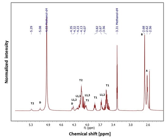 1H NMR spectra of PGSu (400 MHz, methanol-d4) and signals characteristic for the PGSu structure: succinic end group (A), succinic ester (B), succinic acid (C), glycerol spin systems (D, T1, T2, L1.2, L1.3).