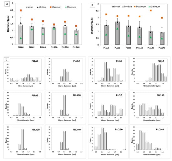 Diameter of electrospun bicomponent fibres with PGSu additive: (A) PLLA2, PLLA5, PLLA10, PLLA20, and PLLA40 in relation to PLLA0 (pure PLLA); (B) PLCL2, PLCL5, PLCL10, PLCL20, and PLCL40 in relation to PLCL0 (pure PLCL) determined with SEM images; (C) histograms of all fibre diameters.