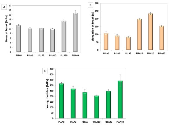 Mechanical properties of bicomponent fibres with additive PGSu to PLLA: (A) stress at break, (B) elongation at break, and (C) Young’s modulus.