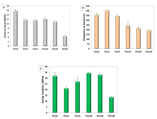 Mechanical properties of bicomponent fibres with additive PGSu to PLCL: (A) stress at break, (B) elongation at break, and (C) Young’s modulus.