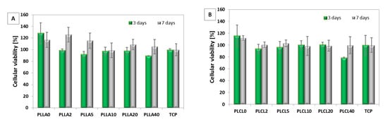 Cellular viability test on L929 cells after 3 and 7 days of cultivation on: (A) PLLA2, PLLA5, PLLA10, PLLA20, and PLLA40 in relation to PLLA0 (pure PLLA); (B) PLCL2, PLCL5, PLCL10, PLCL20, and PLCL40 in relation to PLCL0 (pure PLCL).