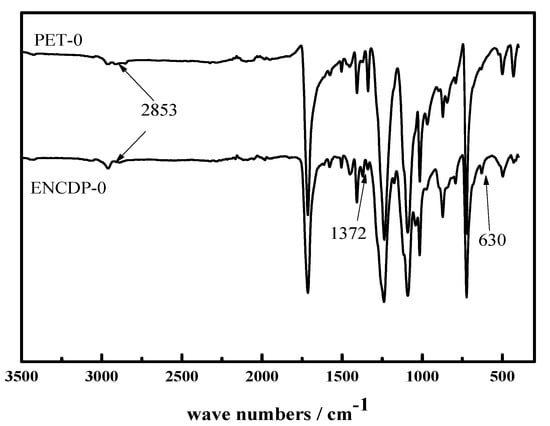In Figure 1, it is revealed clearly that there are three distinct characteristic peaks between PET-0 and ENCDP-0 at 630, 1372 and 2853 cm−1. The absorption peak at 630 cm−1 is caused by S–C stretching vibration, indicating that the SIPE monomer is successfully incorporated into the PET macromolecular chain. The copolyester ENCDP-0 has an absorption peak at 1372 cm−1, which is attributed to the symmetric deformation vibration of the methyl group C–H in the NPG monomer, indicating that the NPG monomer is successfully incorporated into the macromolecule. In addition, copolyester ENCDP-0 owns weak stretching vibration peaks at 2853 cm−1 of –CH2– in PEG monomer, indicating that the PEG monomer successfully incorporated into the macromolecule. It was confirmed by infrared spectroscopy that all the modified monomers have been successfully incorporated into the copolymer macromolecule.