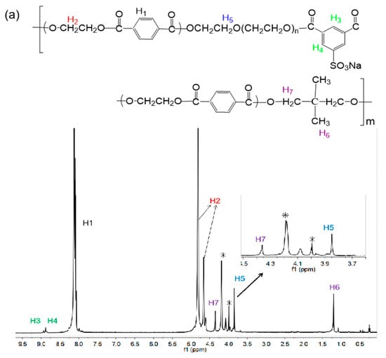 Figure 2 shows the 1H-NMR spectra of ENCDP-0 and PET-0 samples, which revealed that the chemical shifts of ENCDP-0 are distinctly different from PET-0, causing by H protons of PTA, EG, SIPE, and PEG units. Specifically, the hydrogen protons H1 are derived from aromatic protons in the PTA unit, and the corresponding chemical shifts are around 8.20 ppm. The aliphatic hydrogen proton H2 are derived from the EG unit, and the corresponding chemical shift is about 4.7 ppm. The aromatic hydrogen protons H3 and H4 are derived from the third monomer SIPE unit, and the corresponding chemical shifts are around 8.70 and 8.90 ppm. The aliphatic hydrogen proton H5 are derived from the fourth monomer PEG2000 unit, and the corresponding chemical shift are around 3.9 ppm. The methyl and methylene protons of H6 and H7 is derived from the fifth monomer NPG unit, and the corresponding chemical shifts are around 1.20 and 4.4 ppm. The aliphatic hydrogen proton Hx (✳) are mainly derived from the unit of the by-product diethylene glycol (DEG), which are mainly caused by the chemical hydrolysis reaction, and corresponding chemical shift are around 4.0–4.2 ppm.