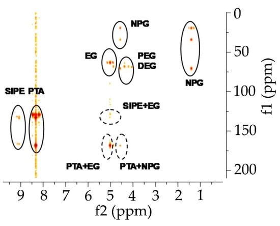 The vertical line is drawn from the f2 axis (C atom) and the f1 axis (H protons), and the intersecting peaks of the two vertical lines directly reflect the coupled signals of the two atoms. It can be seen from the Figure 3 that the solid circle is the itself coupling of C and H of the comonomer. The absence of the agglomeration signal of the modified monomer is due to the low content of the modified monomer and the feeding process. In order to avoid agglomeration, they are first dissolved in ethylene glycol, uniformly stirred, and then slowly added during the feeding process. The dashed circle is the coupling signal between the C and the H of different comonomers. There are intersecting signals between PTA and EG, SIPE and EG, and PTA and NPG, and there is no signal between PTA and SIPE, as well as SIPE and NPG. In addition, the chemical shifts of the H protons of the PEG and the byproduct DEG are well-matched and cannot be distinguished, so the description of the PEG-related sequence structure is not considered. In short, signal assignment was accomplished by comparing the spectra obtained from different copolymer compositions and it was supported by relevant data provided by 2D NMR HETCOR spectra.