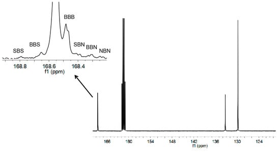 However, when different monomers are added to the copolymerization system, the copolymerization process of various monomers is difficult to control and it is difficult to ensure the quality of the copolymer. In addition, the properties of the copolymer depend not only on the composition of the comonomer, but also on the sequence distribution and randomness of the constituent comonomers [,,]. The latter directly restricts the macromolecular configuration and conformation [,], which in turn affects the crystallization process of macromolecular and the performance of products. Therefore, exploring the sequential structure of resulted copolymer is highly necessary, including that the comonomer sequence distribution is characterized by nuclear magnetic resonance (NMR) spectroscopy and the ideal microscopic sequence structure is analyzed by a statistical model [,]. To date, the characterization of binary copolymers has been widely reported [,,]. However, the research on the sequence distribution for third or more comonomers of copolyester is rare.