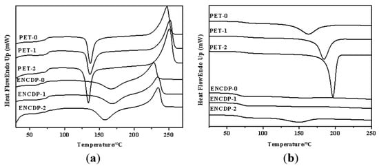 It can be seen from Figure 5 that, comparing to ordinary polyester PET-0, the crystallization ability of the samples ENCDP-X is weakened. The main reasons are that the methyl groups the modified monomer NPG disrupt the regularity molecules and the strong polarity of the sulfonic acid group on the SIPE benzene strengthen the steric hindrance, causing the cold-crystallization temperature increase, and the crystallization temperature, melting temperature decrease []. With the increase of the TiO2 content in the samples ENCDP-X, TiO2 increase the crystallization ability and form perfect grains, causing the cold-crystallization temperature reduces, the crystallization temperature and melting temperature increases, which plays a promoting crystallization role. In summary, TiO2 achieves the effect of matting agent, but the crystallization effect is still not significant, which achieves our purpose of designing macromolecular structure. However, TiO2 plays a significant crystal nuclei role for samples (PET-1 and PET-2).