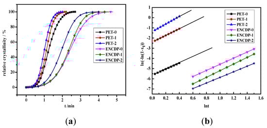 It can be seen from Figure 6a that the curves of the relative crystallinity Xt versus the crystallization time t of all samples are in the S shape, which directly determines the semi-crystallization time (t0.5), that is, the time when the relative crystallinity reaches 50% and reflects the rate of cold-crystallization. The kinetic parameters of non-isothermal crystallization of the copolyester are deduced from Figure 6b and Equation (15), as shown in Table 8.