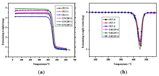 Relative to copolyester ENCDP-X, Td, Tdm and the thermal degradation temperature corresponding to the same thermal weight loss rate are lower, owing to the incorporation of modified monomers and TiO2. The modified monomers PEG and NPG not only disrupted the regularity of the macromolecular segments, but also embedded more methylene fatty segments and ether bonds. The appearance of the ether bonds enhanced the electronegativity of the oxygen atoms on the ester carbonyl groups and enhanced the positive polarity of the H atom on the methylene group at the β position easier to break the chemical bond around the ester carbonyl group and the methylene group. In addition, as the TiO2 proportion increases, the thermal degradation temperature corresponding to the same thermal weight loss rate will decrease to a small extent. TiO2-assisted thermal degradation of polymers occurs by transferring electrons from light-excited TiO2 to molecules to form anionic radicals. The next step involves the extinction process of free radicals, which subsequently attack the polymer. In addition, In the high temperature environment, the crystal is completely destroyed, and the molecular chain is in a free state. The TiO2 disrupts the regularity of polyester molecular chains, reducing the intermolecular tightness and intermolecular stress, and the corresponding chemical bonds are more easily broken [].