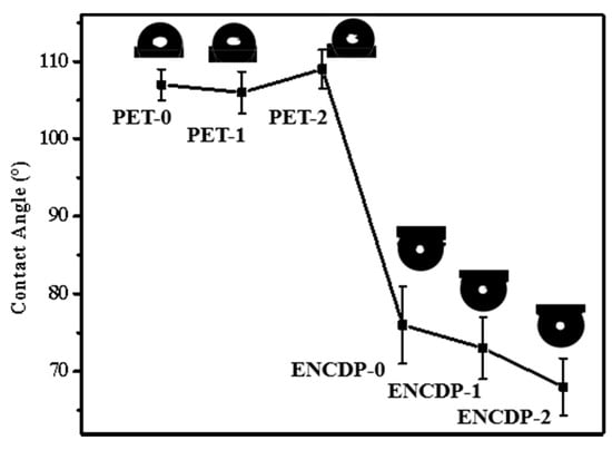 It can be seen from Figure 8 that for the addition of the modified monomers in the copolyester ENCDP-0, the contact angle is reduced from 107° to 76°, and the polymer surface changes from hydrophobic to hydrophilic. Owing to the modified monomer is embedded in the macromolecular chain, increasing the steric hindrance effect, weakening the regularity and symmetry of the copolyester macromolecule, leading to the amorphous region and free volume being increased, increasing space for water molecules; thus, the hydrophilicity is improved for the copolyester []. Moreover, on the basis of copolymerization modification, TiO2 is further mixed to increase the passage of water molecules into the copolyester, leading to the hydrophilicity being further improved, and the contact angle being reduced from 76° to 65°. However, the blending of TiO2 causing the small difference for contact angle. This is because the high crystallinity and the regular macromolecular structure, causing water molecules cannot enter the crystal region. Thus, there is no obvious change in hydrophilic effect.