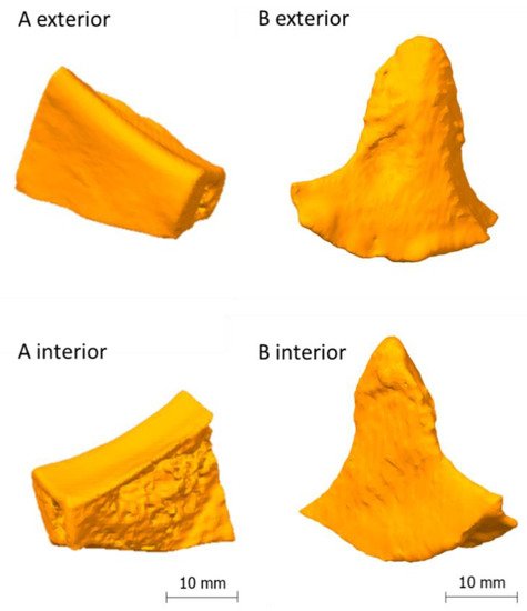All defects were converted and segmented with the help of Invesalius v3.1 (Campinas, Brazil) a free medical open source software used to generate virtual reconstructions of structures in the human body [23]. The segmentation was done by bi-level thresholding. The additional modeling of implant B was done with Meshmixer 3.5 (Autodesk Inc., San Rafael, CA, USA).