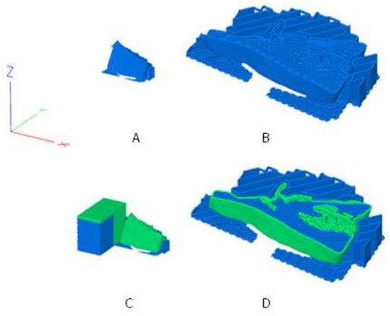 The sliced and orientated maxillofacial implant A [7]; (A): standard implant; (B): standard implant cut at Z = 5 mm and enlarged; (C): performance implant with TPU shell (green) and PETG core (blue); (D): performance implant cut at Z = 5 mm and enlarged; additionally shown in 3: the prime tower to the left of the implant.