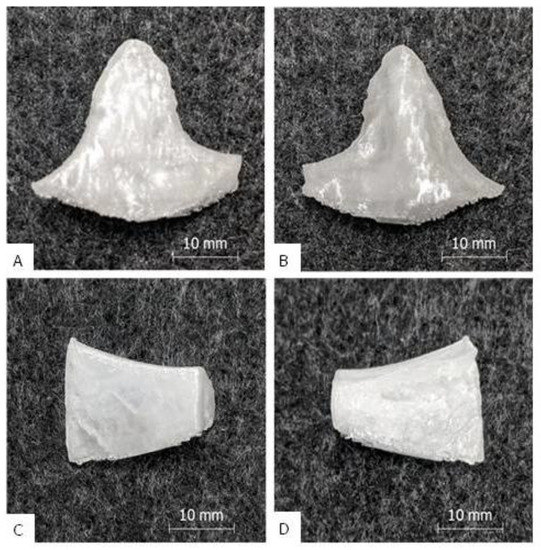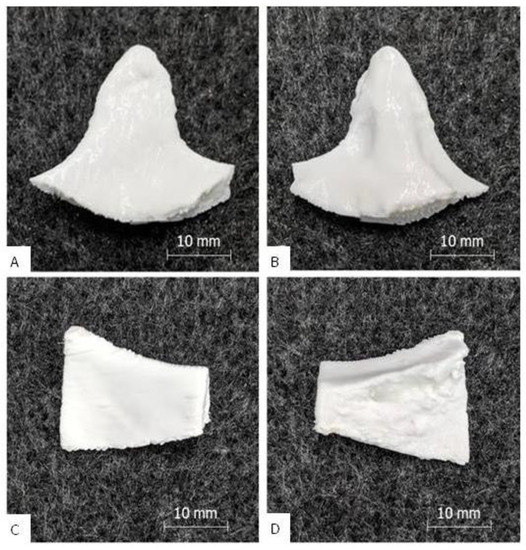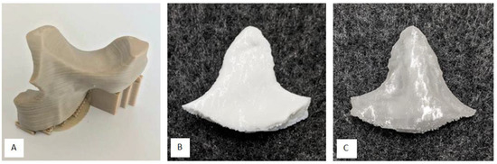 The PETG/TPU dual print of implant A and B exhibited good results, which are shown in Figure 4. Removal of the PETG support structure from the TPU outer layer was more difficult than with the standard implants. The supported interfaces had to be carefully ablated with key files to obtain an acceptable clean surface. In contrast, the non-supported surface of all implants was smooth and clean and the PETG core material was completely enclosed by the TPU shell. On the interior side of implant A, rough structures were visible due to the cancellous bone structure. The appearance of the implants was pure white and shiny and was determined by the TPU. There were no cracks or extrusion inhomogeneities and only slight layer start marks. The implants felt strong and rigid, and a manual compression and bending test also showed no “crackling”. Only the peripheral corners were stiffer than the main body, as only TPU shell layers without PETG core material were printed here due to the small wall thickness. The general haptic surface texture was softer and less smooth compared to the PETG prints. The printing time for implant A was 2 h and 50 min and, for implant B, 2 h and 59 min, which was at maximum 11% longer than the predicted printing time. The build-up rate was approximately 4 g/h.