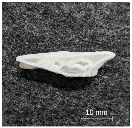 A second bone defect (implant B) was created by the resection of the muscular process (pterygoid process) on the left side of the human mandible (approx. 3.5 cm × 3.0 cm × 1.0 cm), as a potential result of a pathological bone lesion resection or of a congenital missing or malformed anatomical hard tissue structure. The aim was to replicate the second defect, i.e., to “model” the defect positive digitally and then to print the implant.