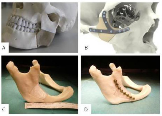 Repairing three-dimensional (3D) defects is a challenging part in maxillofacial surgery. Such defects can occur for many reasons, e.g., after surgical resections of pathological lesions such as cysts or tumors or after traumatic events such as traffic accidents or violent crimes. In this context, with about 40%, the lower jaw represents the highest occurrence of all facial fractures in the maxillofacial field [1]. In Germany, more than 10,000 facial mouth/jaw surgeries are operated annually, and treatment times are up to 14 h [2]. The reconstruction of maxillofacial defects is clinically important because if they are not restored, defects variable in size and form remain and might cause disfigurements and/or functional impairments. Such reconstructions always involve surgery and a patient-specific treatment plan [3].