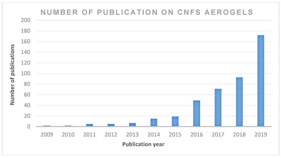 The number of scientific publications contributing to the subject “cellulose nanofibre; CNF and aerogel” by year (search done through ScienceDirect on 6 June 2020 (from 2009 to 2019).