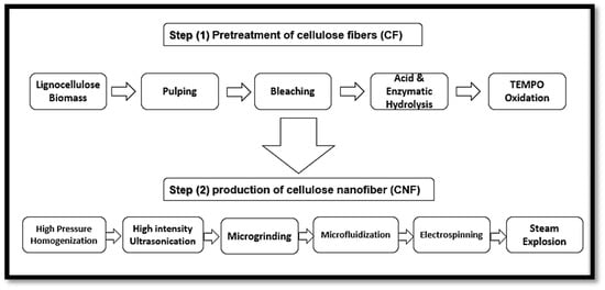 According to Madsen [51], the plant primary cell wall consists of 9–25% cellulose microfibrils, compared to the secondary wall that contains 40–80%. Furthermore, the primary cell wall consists of 25–50% and 10–35% of hemicelluloses and pectin, while the secondary cell is composed of only 10–40% hemicelluloses and 5–25% lignin. However, the precursor material referred to as lignocellulose biomass should be cleaned and dried. After the isolation of lignocellulose biomass, it still contains many accompanying materials apart from cellulose such as hemicellulose and lignin. Figure 4 presents the structure of a typical plant cell, presenting details of the layers and the accompanying materials that the cell wall is composed of. The removal or elimination of accompanying materials is required as hemicellulose carries carboxylic groups, which give the final CNFs a slightly negative charge, causing repulsion between the fibres and preventing their aggregation in the wet state [52]. However, the isolation of CNFs can be conducted in two main steps, which are the pre-treatment and production steps. The first step involves the pre-treatment of cellulose fibres (CF) while the second step involves the production of cellulose nanofibre (CNF), as presented in Figure 5 [50]. To isolate nano cellulose (NC) from lignocellulosic biomass, it must undergo delignification, which is a necessary process consisting of pulping until depolymerisation, followed by the solubilisation of lignin and hemicelluloses, then by bleaching with chemical agents [50,53].
