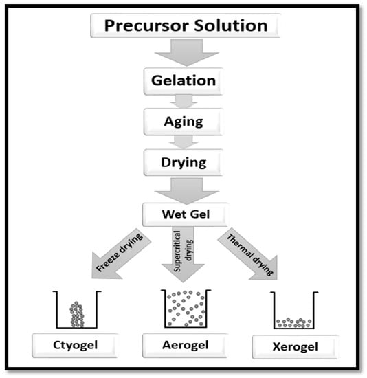 Numerous factors influence the gelation time of the colloidal solution. The precursor material, concentration of the colloid solution, the additives (if any) and the parameters of the solutions such as pH, temperature, etc., [62,63,64]. After the gelation time, many precursor materials require some additional steps to strengthen the gel network [62]. Drying of the gel network takes place after the completion of gelation time. The surface tension of the pores of the solid network is minimised with freeze-drying to form cryogel, or thermal drying to form xerogel or supercritical drying process to form aerogel (Figure 6).