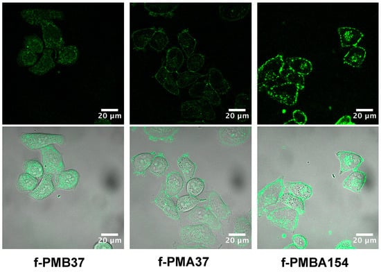 Figure 3 shows the results of observation of the interaction between the fluorescent labeled MPC polymers and cells, using a confocal microscope. In all of three types of MPC polymer (f-PMB37, f-PMA37, and f-PMBA154), fluorescence derived from the MPC polymer was observed inside the cells. From this observation, it is considered that these MPC polymers interacted with the cell membrane and were taken up by the cells. In addition, a difference was observed in the fluorescence distribution, depending on the type of MPC polymer. In the case of f-PMB37, having a hydrophobic group, fluorescence was observed mainly inside the cells. From this finding, it is concluded that f-PMB37 was taken up into the cell by interacting with the cell via the hydrophobic group. In contrast, as f-PMA37 and f-PMBA154 have a cationic group, fluorescence was observed not only inside the cell but also in the vicinity of the surrounding cell membrane. These cationic MPC polymers adsorbed to the cell membrane by interaction with its negative charge. In addition, for these cationic MPC polymers, differences were observed in the distribution around the cell membrane and inside the cells. In the case of f-PMBA154, having a hydrophobic group, fluorescence with almost the same intensity was observed around the cell membrane and inside the cell. This polymer was easily taken into the cell through the lipid bilayer, due to the effect of its hydrophobic unit. However, f-PMA37 and f-PMBA154 were adsorbed on the negatively charged cell membrane, via the cationic unit of the polymer. It is considered that the hydrophobic BMA unit imparts affinity to the hydrophobic region of the cell membrane, while the cationic AEMA unit interacted with the negative charge on the membrane surface, in interactions between MPC polymer and cells.