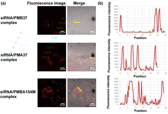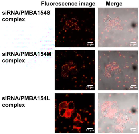 To understand transportation pathway of the siRNA/MPC polymer complex through the cell membrane, uptake of Cy3-labeled siRNA in a 4 °C environment was observed using with a confocal microscope (Figure S5). The fluorescence derived from siRNA was observed around the cell membrane in the presence of PMBA154M or PMA37, but no fluorescence was observed inside the cells. Therefore, these MPC polymers did not transfer siRNA into cells at 4 °C. It is known that, when solute uptake into cells occurs by endocytosis, which uses metabolic energy, the solute uptake is not observed at 4 °C [20,47]. As these MPC polymers showed the ability to transfer siRNA into cells at 37 °C, we concluded that endocytosis was the dominant transportation pathway of the siRNA/MPC polymer complex.