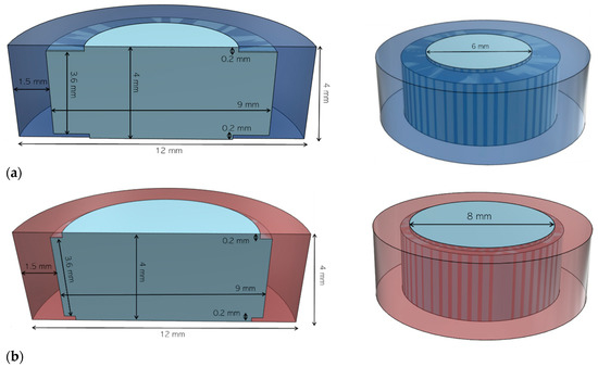 (a) Vertical cross section (left) and top view (right) of the 6 mm printlet 3D model; (b) vertical cross section (left) and top view (right) of the 8 mm printlet 3D model.