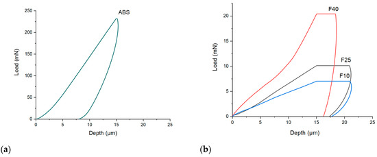 Filaments were characterized in terms of hardness using a nanoindenter. Hardness values can help to predict the printability of the filaments together with the other mechanical measurements [69]. Results for the ABS filament (Figure 3a) showed that ~250 mN was necessary to indent the surface of a filament down to 15 µm in depth. Once 15 µm was reached, the load was held constant for 30 s to evaluate any further penetration. Almost no further penetration was recorded, indicating that the filament was very tough.