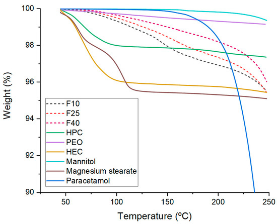 TGA was performed for the filaments with different drug loadings (F10, F25, and F40) to assure their stability at printing temperature (Figure 4). Core filaments (F10, F25, and F40) also showed over 95% of the total weight at printing temperature (170 °C), indicating the suitability of these compositions for FDM 3D printing.