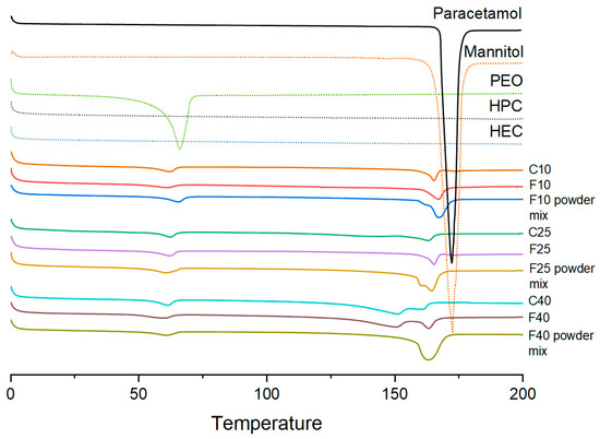 XRPD and DSC analyses were performed to evaluate in which form the drug was incorporated in the filaments and cores (Figure 5 and Figure 6). XRPD data showed broad halos for F40 and F25 discs indicating that the drug was incorporated in an amorphous form. F10, containing a higher amount of HPC (62% w/w), showed a diffraction pattern similar to HPC powder, with some small peaks at 18 and 23°, indicating the presence of either mannitol and/or PEO in a crystalline form. The presence of crystalline material only in the F10 disc can be explained with the lower extrusion temperature (110 °C compared with 120 °C for the other two filaments) or by the plasticizing effect of the increasing drug loading that might have contributed to better solubilization of mannitol and/or PEO in F25 and F40. DSC analysis (Figure 6) showed small endothermic peaks at 70 °C for all the printed formulations, indicating that part of PEO was still in a crystalline form after extrusion and printing. In all the powder mixtures, a broader peak (composed of two peaks) was present at 160–165 °C, indicating that both paracetamol and mannitol were crystalline. However, only a small endothermic peak was present at 170 °C in all the filaments indicating that the drug became amorphous after extrusion. Only in F40 was a second endotherm still present (shifted at 150 °C), indicating that a small amount of the drug was still in crystalline form but could not be detected by XRPD (F40 disc showed a complete amorphous diffraction pattern, Figure 5).