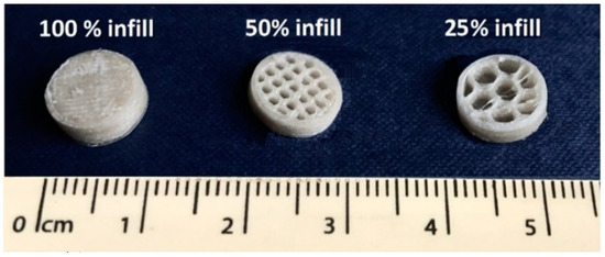 The filament with the highest drug loading (F40) exhibited the most optimal mechanical properties and was therefore selected for the manufacture of printlets. Three infill percentages (100%, 50%, and 25%) were selected to explore the feasibility of controlling the release profiles. Cores were successfully printed at each respective infill (Figure 7) with a consistent diameter of 9.0 ± 0.1 mm. HPLC analysis of the drug loading of the cores showed the absence of drug degradation with an assay value of 39.4 ± 0.4%. This was in alignment with a previous study where paracetamol was proved to be stable at similar operational temperatures for FDM printing [72].