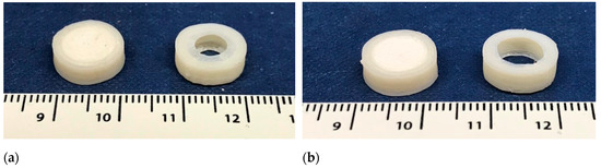 To achieve zero-order release, an insoluble shell was 3D printed with ABS onto the core to provide a rate-limiting barrier. ABS filament was selected for its high toughness and water resistance that provide a shell able to withstand long dissolution tests without deformation [73]. A similar 3D model was successfully able to release drug linearly using inkjet 3D printing [32]. Two shell models (Figure 1) were designed with 6 mm and 8 mm size apertures, respectively (Table 3). The printlets (P) were identified with the first number indicating the aperture diameter and the second number indicating the percentage of infill.